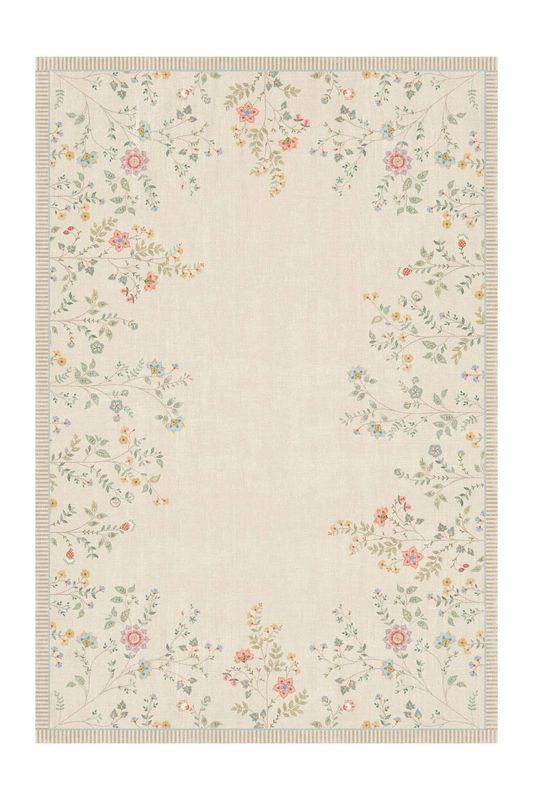 The by Pip Campo de Flores Off-White carpet is an elegant and romantic addition to your interior. The design features graceful floral vines in soft shades of pink, green and blue, playfully placed along the edges. The fresh off-white background adds a light and refined look. This carpet instantly brings a touch of charm and warmth to any room.